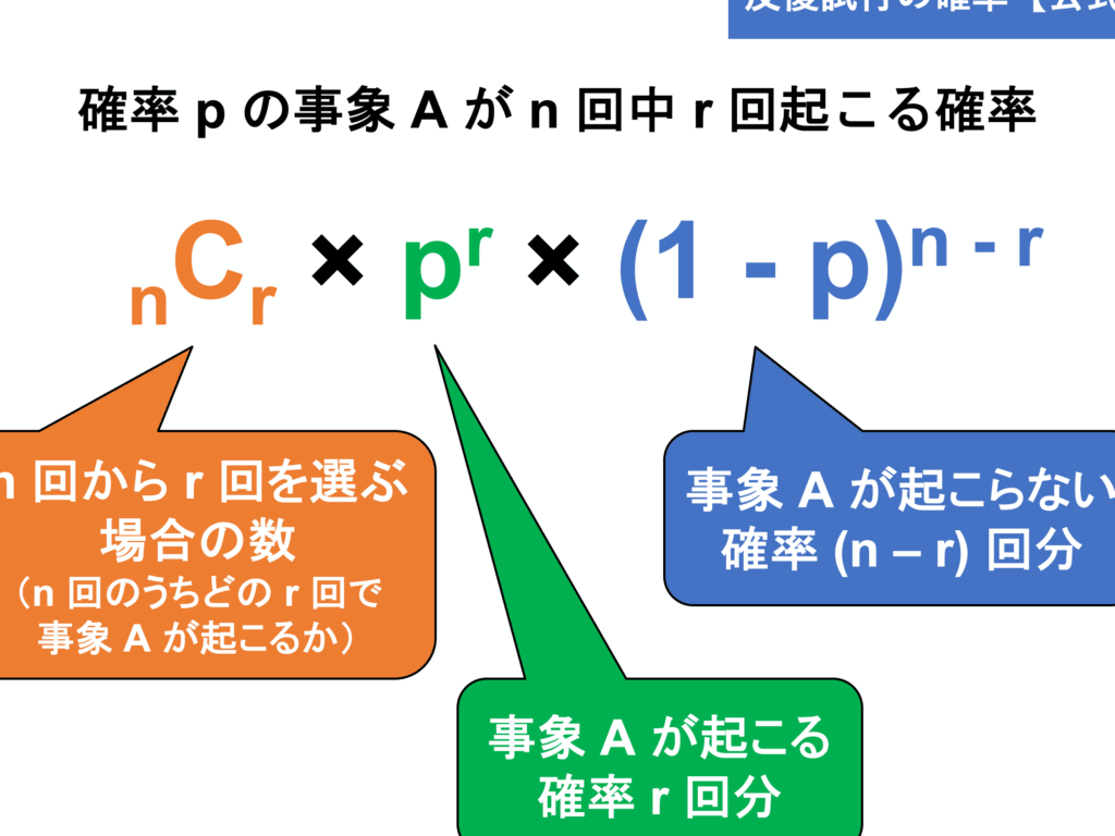 - 定義: 独立な試行は、ある出来事が他の出来事に影響を与えないこと。例えば、一回目のサイコロの結果が二回目には関係しません。