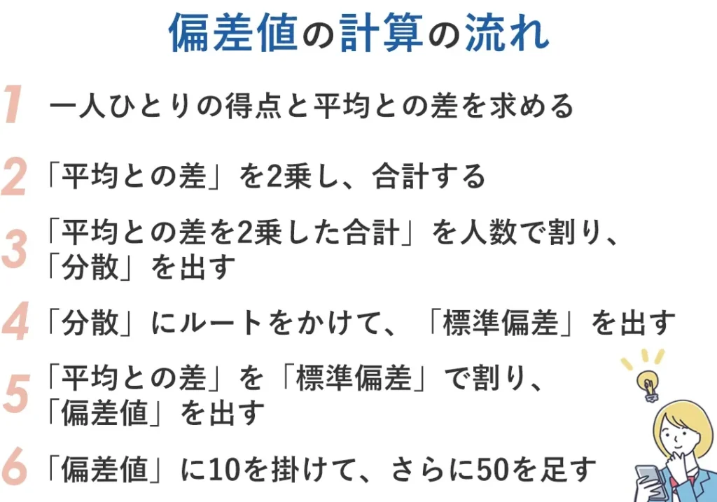 text{偏差値} = left( frac{text{個人点} – text{平均点}}{text{標準偏差}} right) times 10 + 50