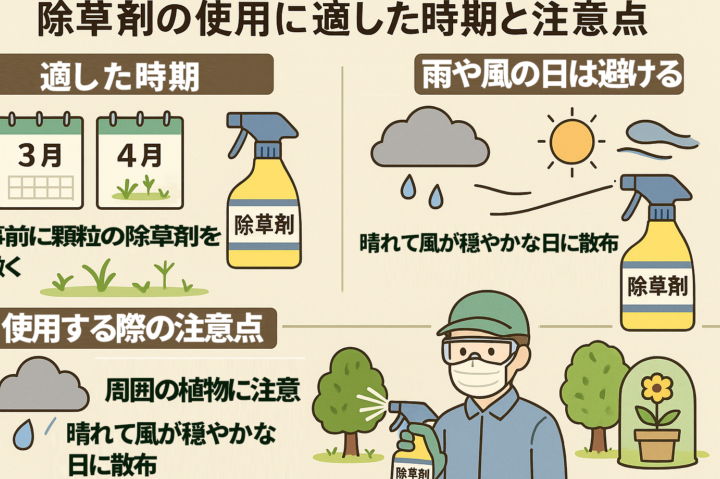 - 風向き: 風が強い日や不安定な天候では避けるべきです。風によって除草剤が意図しない場所に飛ばされる可能性があります。