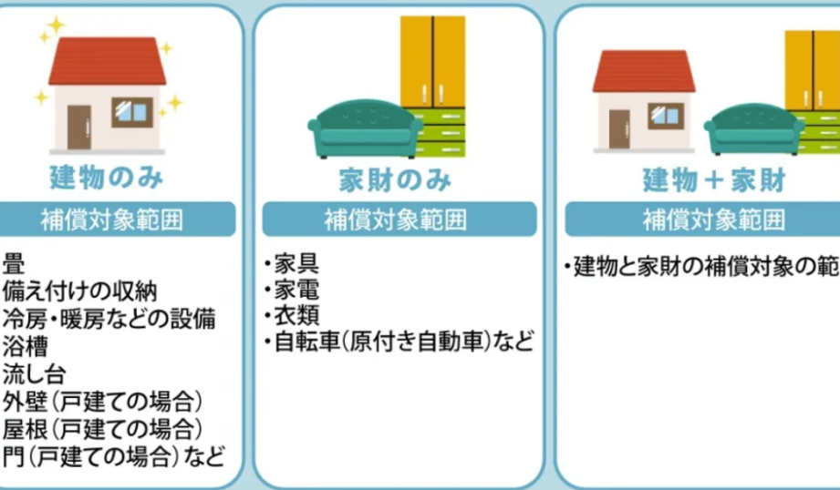 - 家財保障:家具や電化製品が損失した場合、その復元または買い替えにかかる費用。