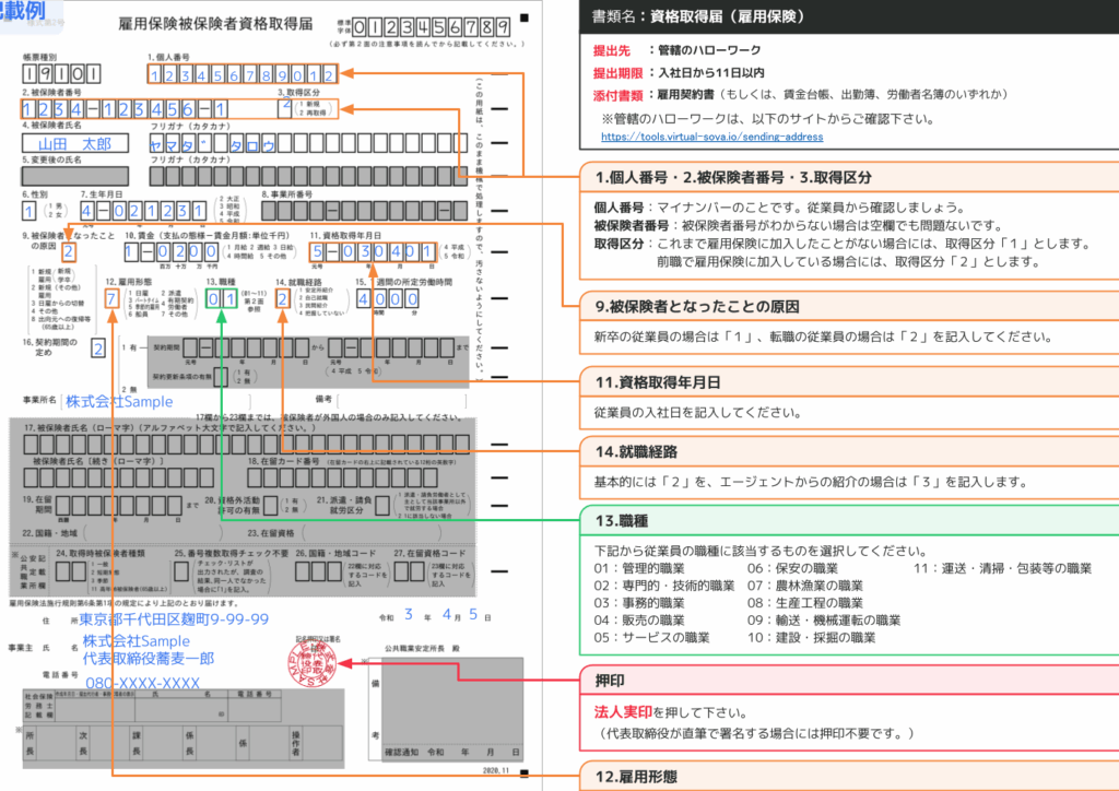 - 雇用保険被保険者資格取得届:労働者ごとに記入し提出すること。