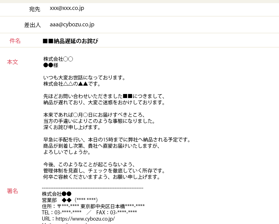 以下は、ビジネスシーンにおける謝罪メールの一例です。