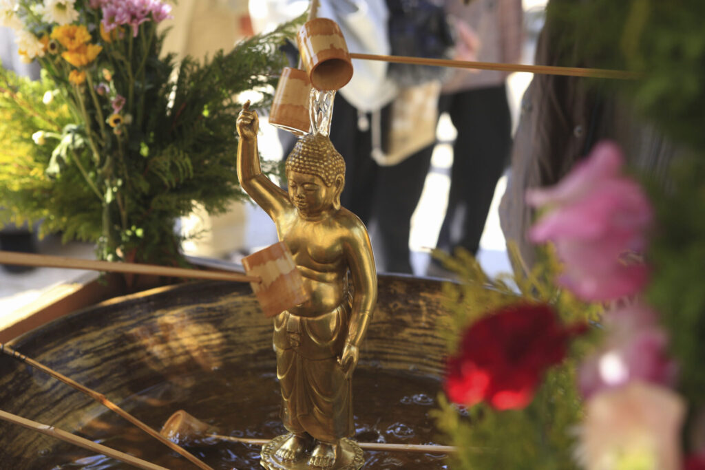 - 日本では、「灌仏会」と呼ばれる祭りが主催され、この時期にお釈迦様の像に甘茶をかけます。