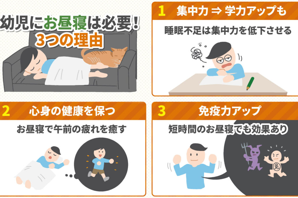 - 幼児期 (1〜3歳): 夜間一度に長時間寝る傾向があります。この時期には自立したお昼寝から夜間まで安定したリズム作りが大事です。