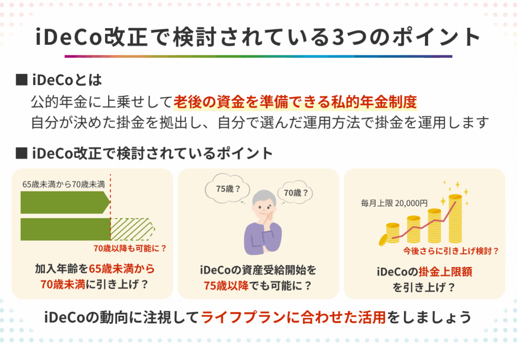 iDeCoの制度は時折見直されることがあります。この見直しにより、私たちの運用戦略に影響が出ることがあります。重要なポイントは以下の通りです。