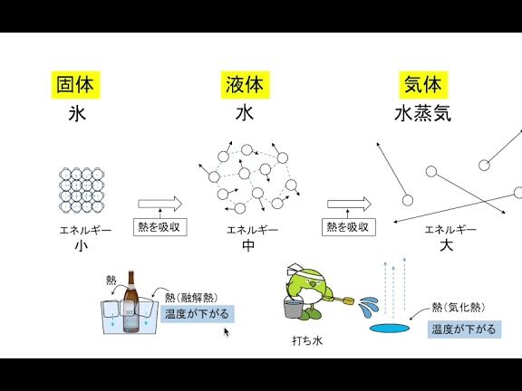 - 融解熱:氷が溶ける際にはエネルギー(熱)が必要です。このエネルギーは周囲から吸収され、その結果温度が下がります。