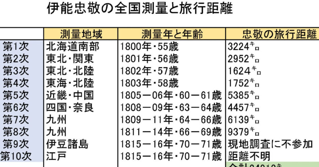 私たちが知っている通り、彼は1785年に本格的な測量活動を開始し、その後、日本全土を対象にして約17年間も活動を続けました。この長期間にわたる努力によって、多くの地域で正確な情報が得られました。例えば、関東地方や九州地方では特に詳細なデータが記録されています。
