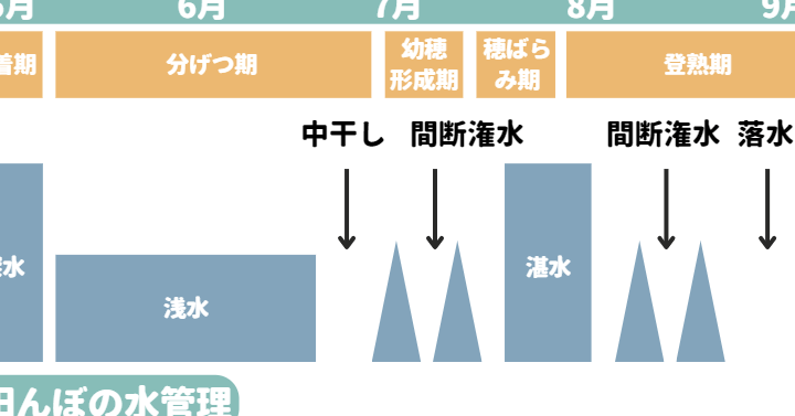 - 灌漑(かんがい): 地面から水を引き入れることで、田んぼ全体に均等に水を供給する方式。