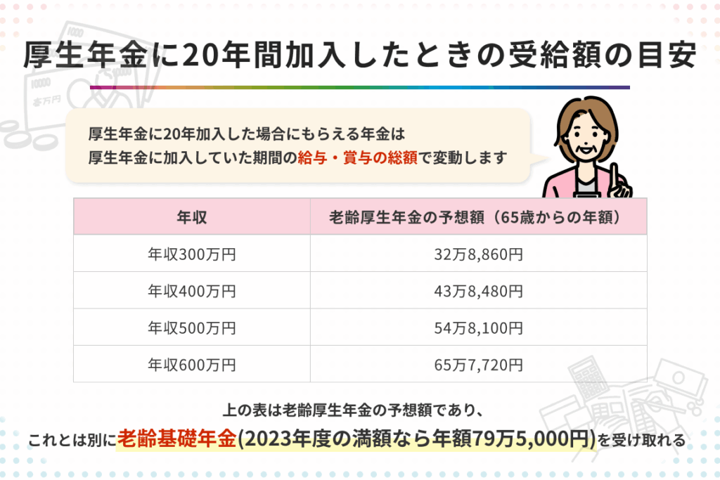 厚生年金に20年間加入することは将来の生活設計にとって非常に重要です。我々が理解すべきは、受給額は平均標準報酬や加入期間によって大きく変動するということです。収入が高い時期を長く持つことで、将来的な年金額も増加します。