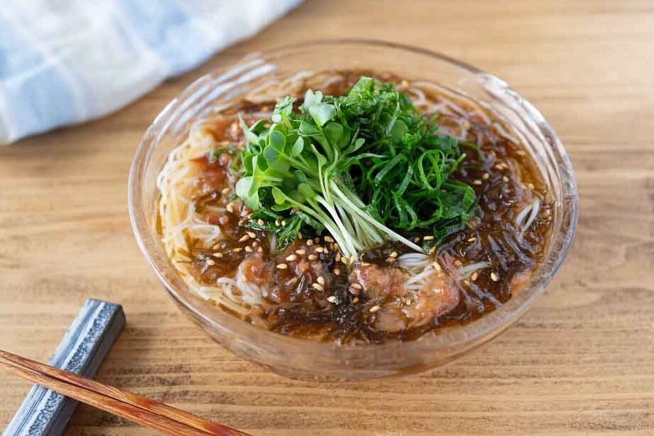 次に考えたいのは、冷製パスタです。茹でたパスタにもずくをトッピングし、ごま油や青じそのドレッシングで和えるだけで、美味しいサラダ感覚のメニューができます。このアプローチは特に夏場にぴったりです。