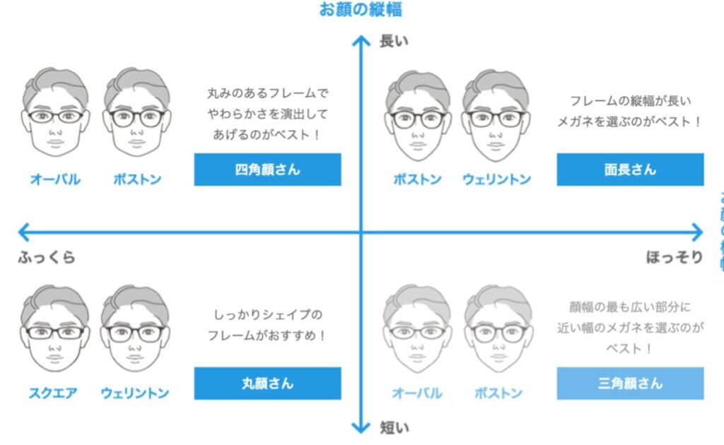 - フレーム幅:顔幅に対して適切なフレーム幅を選ぶ。