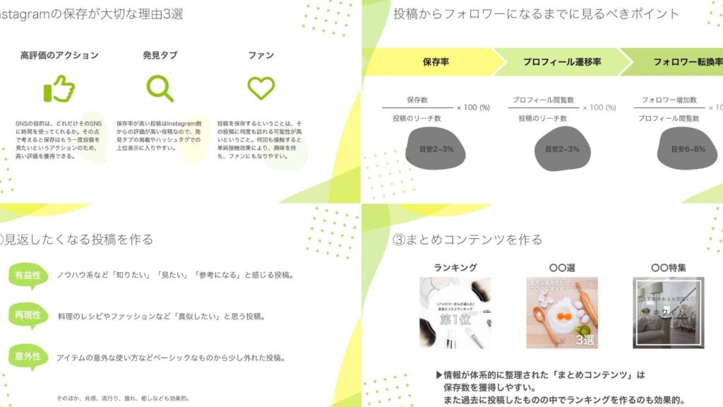 さらに、トレンドに敏感になることで競争優位性も確保できます。最新の流行やフォロワーからの反応を分析し、それに基づいたコンテンツ製作につなげることで、市場で目立つ存在になれるでしょう。また、多様な投稿形式(静止画・動画・ストーリー)によって、一貫したブランディング戦略も実現可能です。