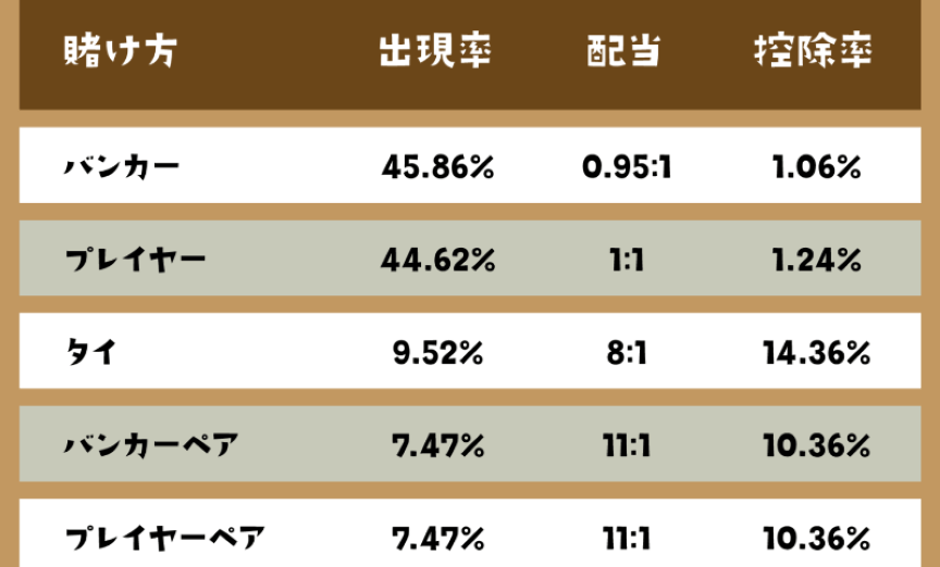 バンカーへの賭けは、多くの場合最も優れた選択肢とされています。バンカー手が勝つ可能性は約50.68%で、これより高い期待値を持っています。この場合、配当は1対1ですが、5%の手数料が引かれるため、その点も考慮する必要があります。安定した収益を目指すなら、このオプションがおすすめです。