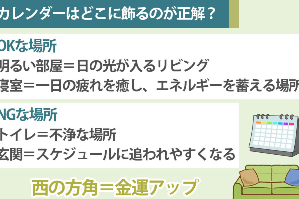 カレンダーは、目立つ場所に掛けることが望ましいです。例えば、以下のような場所があります: