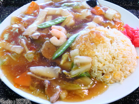 - 炒飯皿に盛った上から、とろみあんかけソースをかけて完成。
