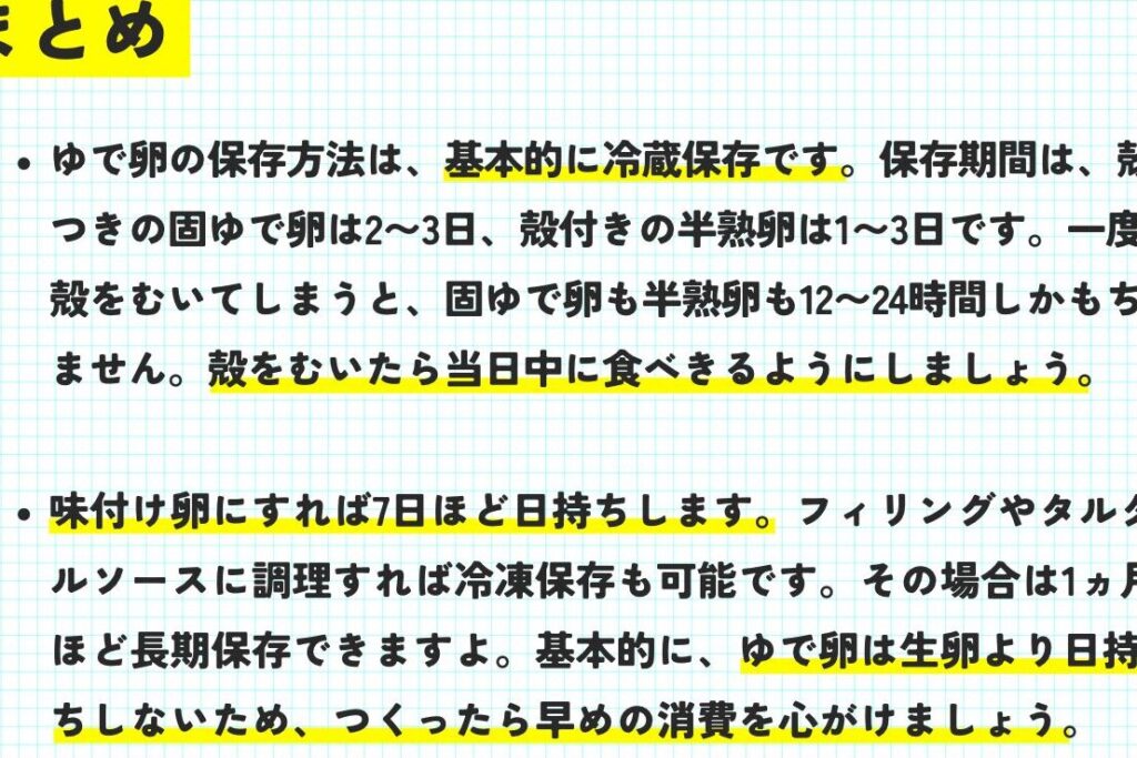 - 生卵の場合: 賞味期限は約3週間ですが、新鮮なうちに消費することが望ましいです。