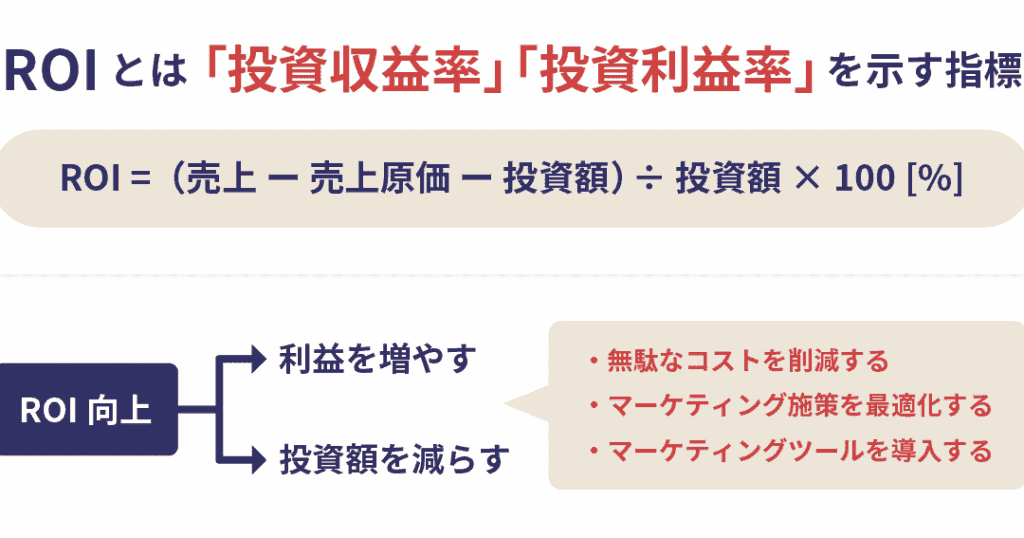 - ROI(投資収益率): 投資した金額と得られた利益との比率を示す。